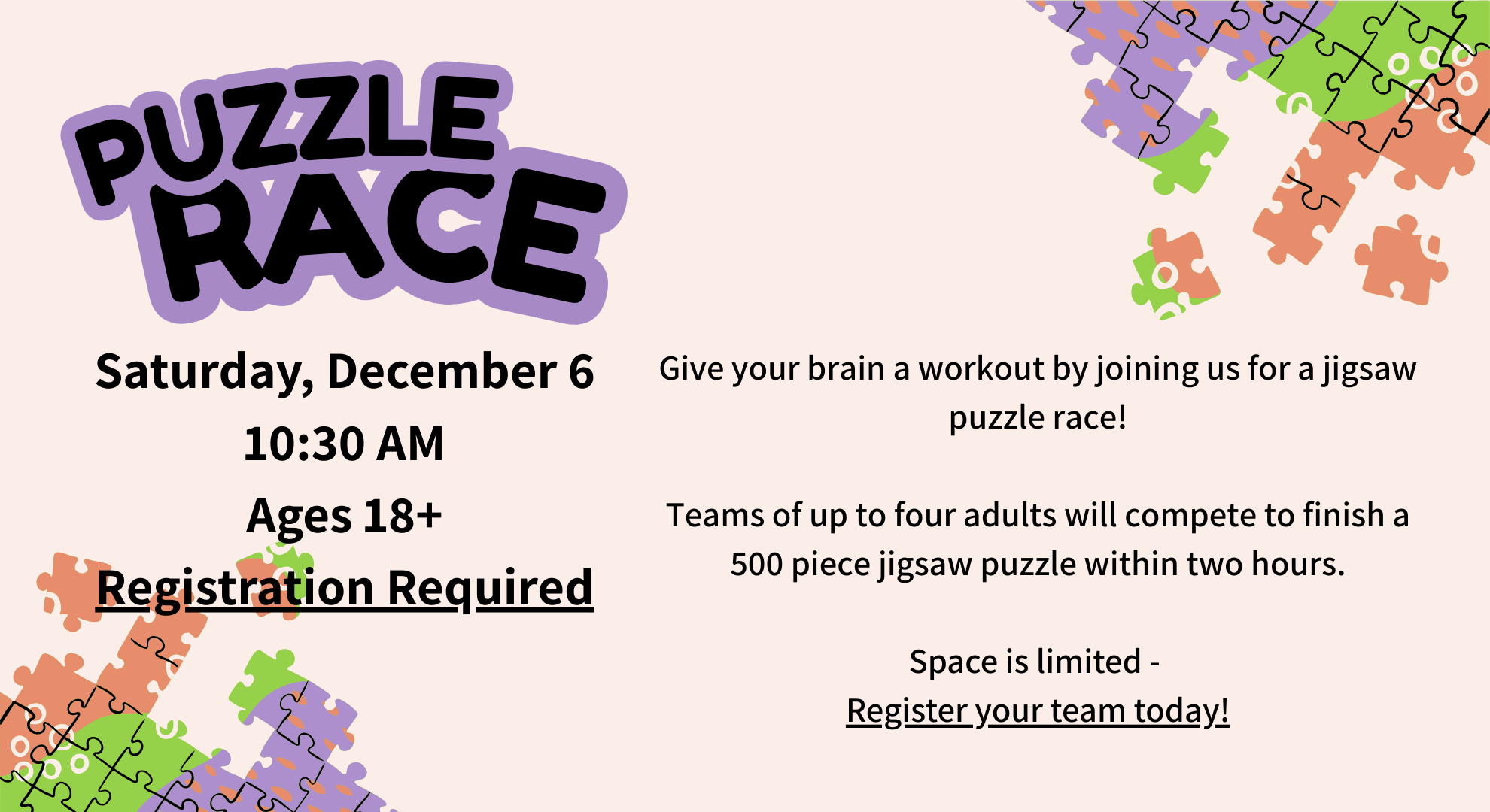 Gather your team together and spend a morning puzzle racing with other teams!