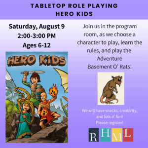 Join us in the program room, as we choose a character to play, learn the rules, and play the adventure Basement O’ Rats!