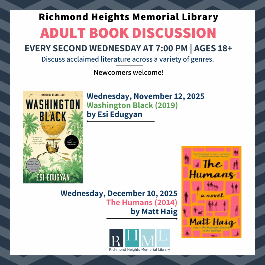 Join the Richmond Heights Memorial Library Adult Book Discussion group to discuss November’s selection, Washington Black, by Esi Edugyan. We will meet on November 12 at 7:00pm.