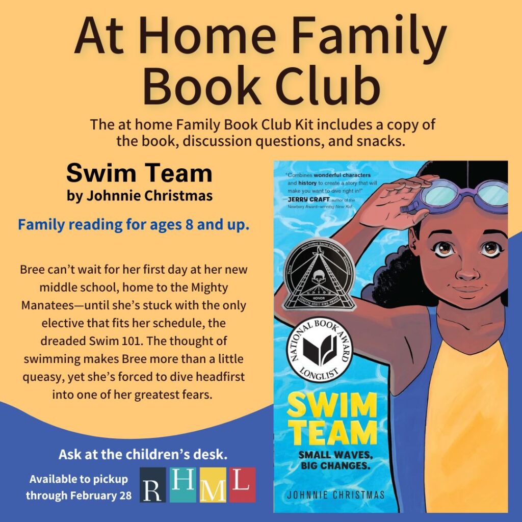 The At-Home Family Book Club Kit includes a copy of the book to check out, discussion questions, and snacks.