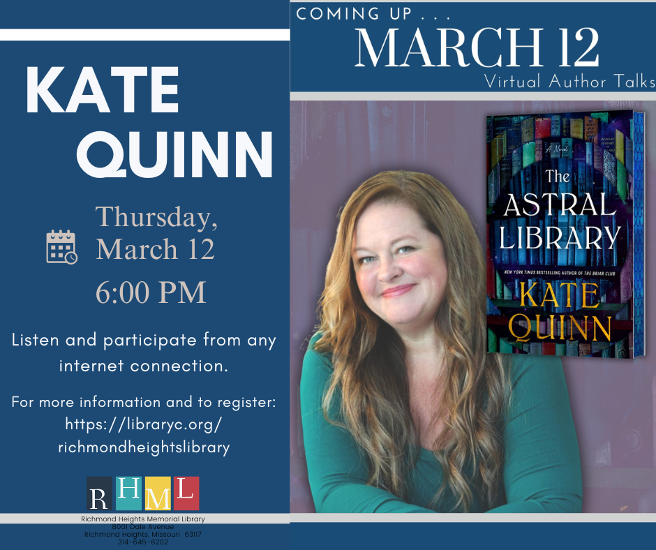 You’re invited to join Virtual Authors Live for a conversation with acclaimed author Kate Quinn about her latest fantastical work, The Astral Library, which poses the question: Have you ever wished you could live inside a book? Welcome to the Astral Library, where books are not just objects, but doors to new worlds, new lives, and new futures.