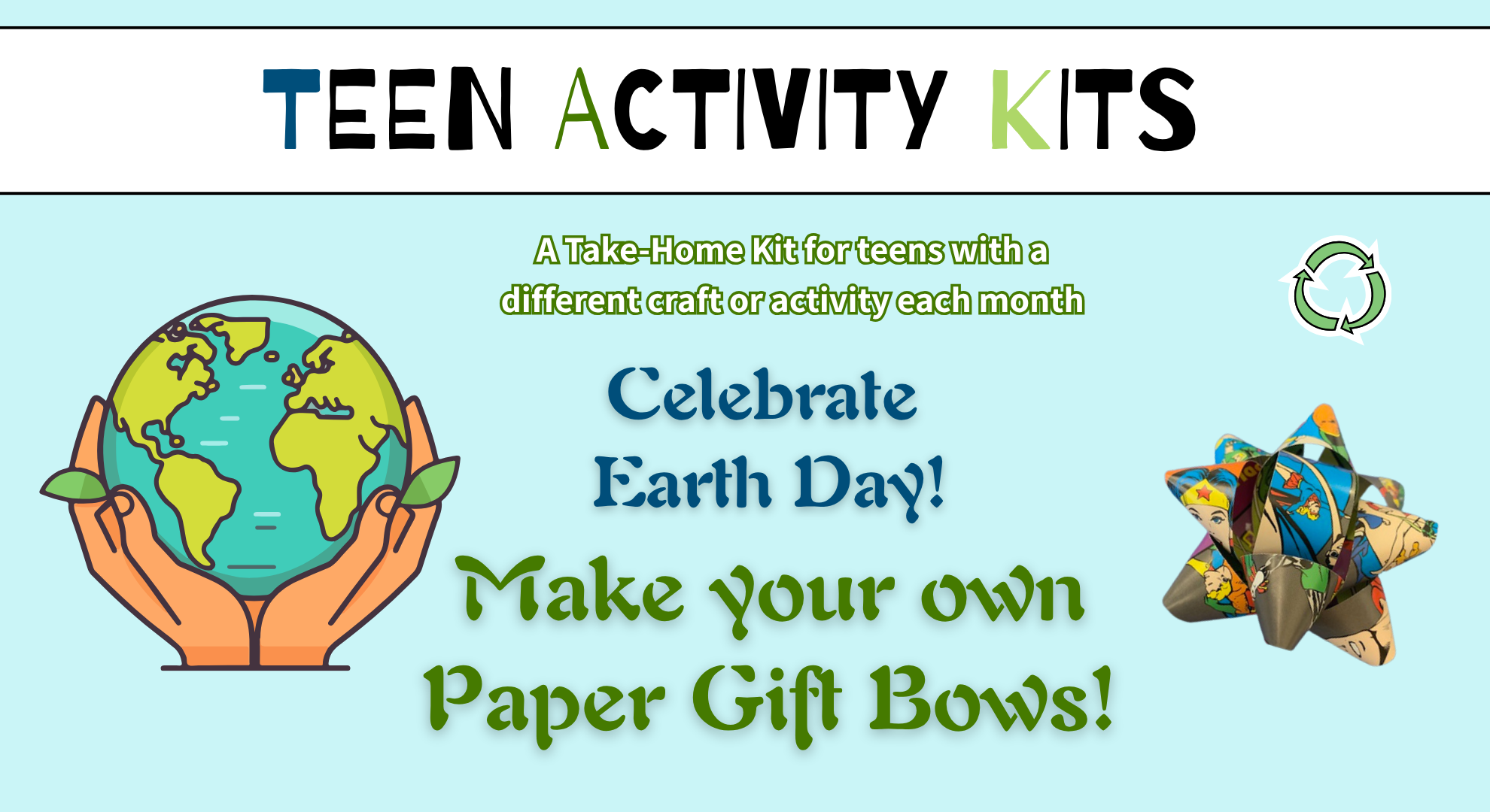 Teen Activity Kits are take-home kits that feature a different craft or activity each month. Celebrate Earth Day! Earth Day is April 22nd, and we’re celebrating by making our own Gift Bows out of paper and old picture books. It’s fun, and you’ll never need to buy another plastic gift bow again! Kits include supplies […]